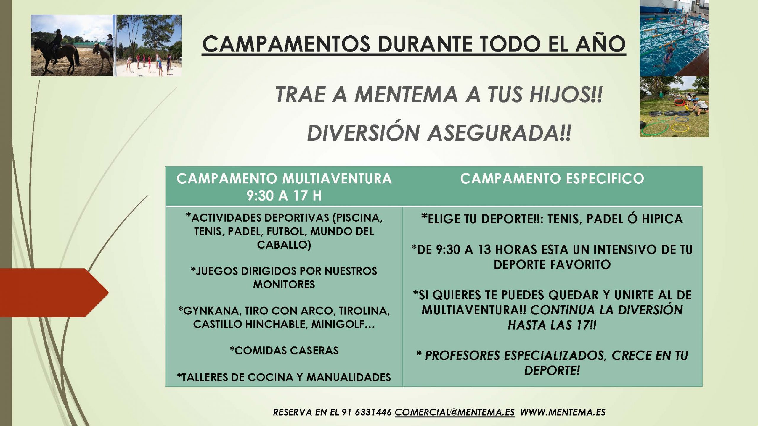 - CAMPAMENTOS ESPECÍFCOS: para niños de 6 a 16 años, estos campamentos están enfocados a los deportes de tenis, pádel, hípica o fútbol. Los alumnos realizarán actividades relacionadas con el deporte escogido desde las 9.30h hasta las 13.00h. En este caso, disponemos de horario sólo de mañanas, pero os ofrecemos el día completo hasta las 17.00h con actividades de multiaventura.